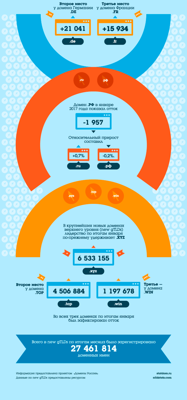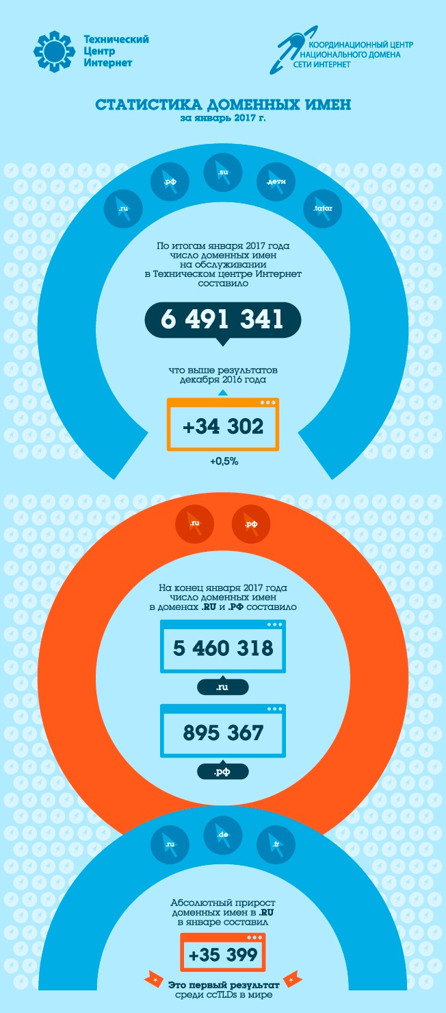 По итогам января 2018 года число доменных имен на обслуживании в Техническом центре Интернет составило 6 342 728. Это ниже результатов декабря 2017 года на 55 504 имени или на 0,87%. На конец января 2018 года число доменных имен в .RU составило 5 326 642, а в .РФ – 857 089. Оба домена в январе показали отток: в .RU отток составил -42 065 доменных имен или 0,78%, в .РФ – -13 314 доменных имени или 1,5%.