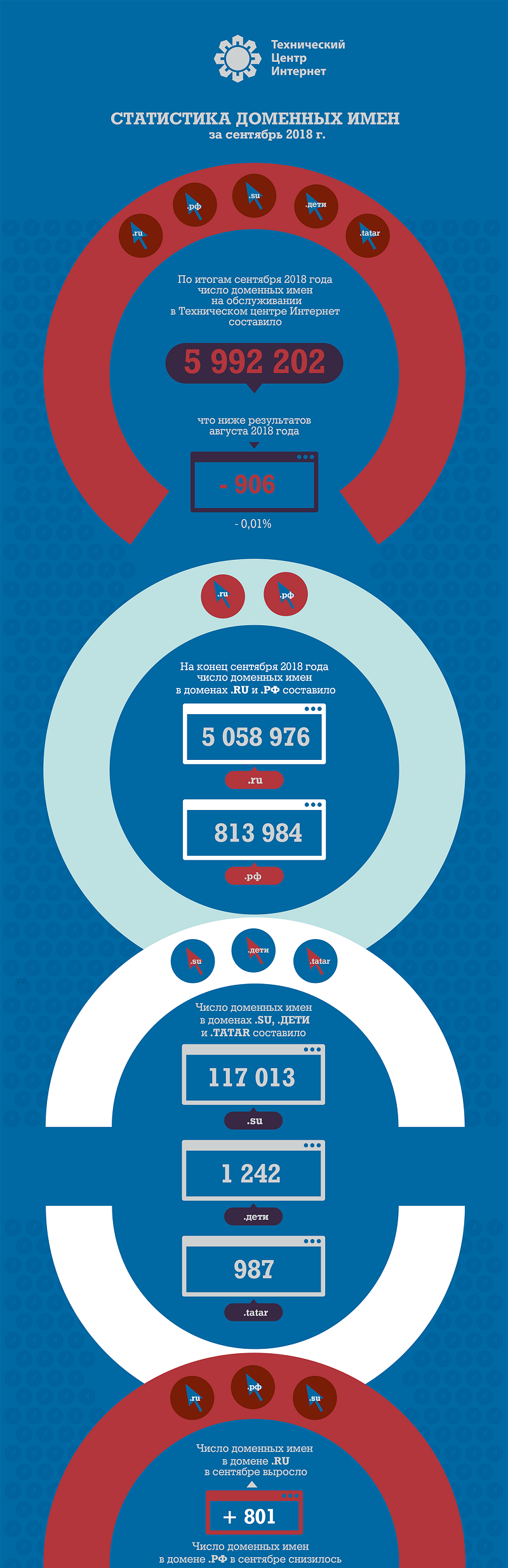 По итогам сентября 2018 года число доменных имен на обслуживании в Техническом центре Интернет составило 5 992 202. Это ниже результатов августа 2018 года на 906 доменных имен или на 0,01%. На конец сентября 2018 года число доменных имен в .RU составило 5 058 976 доменных имен, в .РФ – 813 984 доменных имени. Домен .RU после более чем года падения вырос на 801 доменное имя или на 0,01%, а вот в домене .РФ негативную тенденцию пока переломить не удалось: отток в .РФ составил -1689 доменных имен или 0,2%. Также незначительно снизилось число доменных имен в домене .SU – с 117 033 доменных имени в августе до 117 013 доменных имен в сентябре. В домене .ДЕТИ 1242 доменных имени, в домене .TATAR 987 имен.
