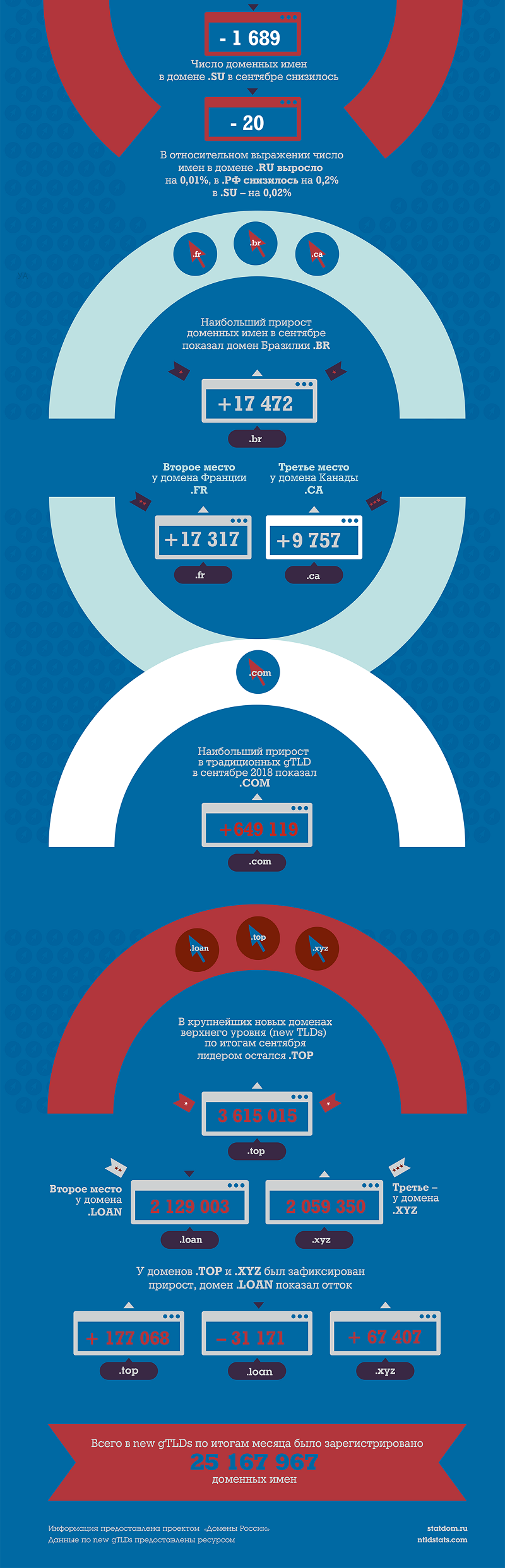 Тройка лидеров в национальных доменах осталась прежней. Наибольший прирост среди ccTLDs в мире по итогам сентября 2018 года вновь зафиксирован в домене Бразилии .BR (+17 472). Второе место с минимальным отставанием опять занял домен Франции .FR (+17 317). Третье место – у домена Канады .CA (+9 757). Сентябрь подтвердил тенденцию августа: снова отток в доменах Германии, Великобритании, Евросоюза.