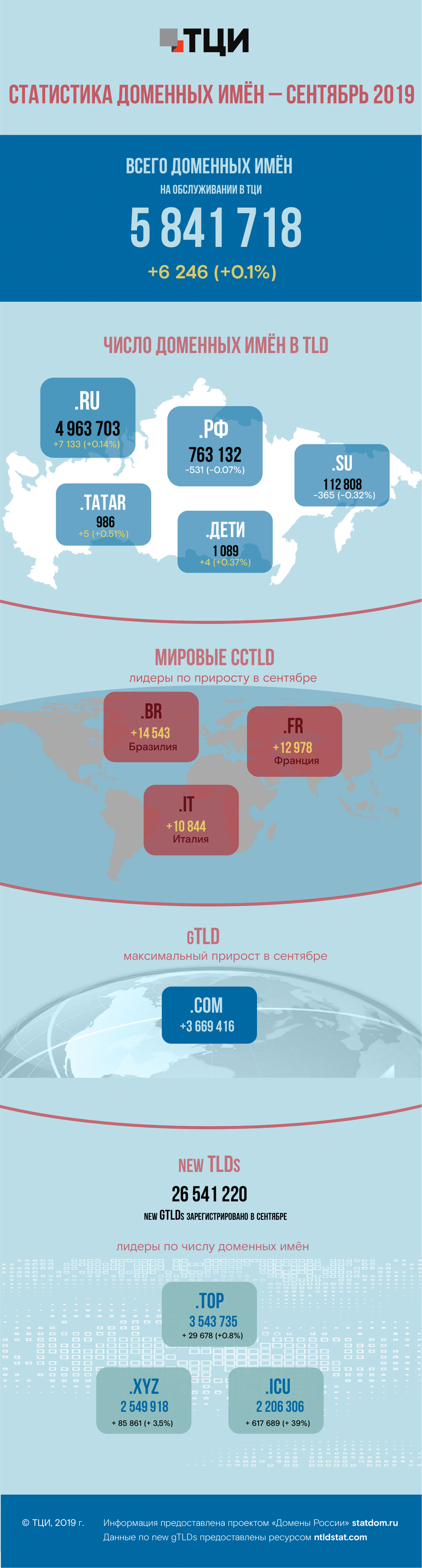 Среди крупнейших новых доменов верхнего уровня (new TLDs) наибольший результат по итогам сентября снова показал домен .TOP (3 543 735 имён), второе место опять у .XYZ (2 549 918). Третью позицию удерживает домен .ICU (2 206 306). Все лидирующие по количеству доменных имён new gTLD демонстрируют прирост: .TOP относительно августа вырос на 29 678 доменных имён (+0,8%), .XYZ – на 85 861 (+3,5%), а .ICU подрос даже больше, чем в августе - на 39%, или 617 689 доменных имён.