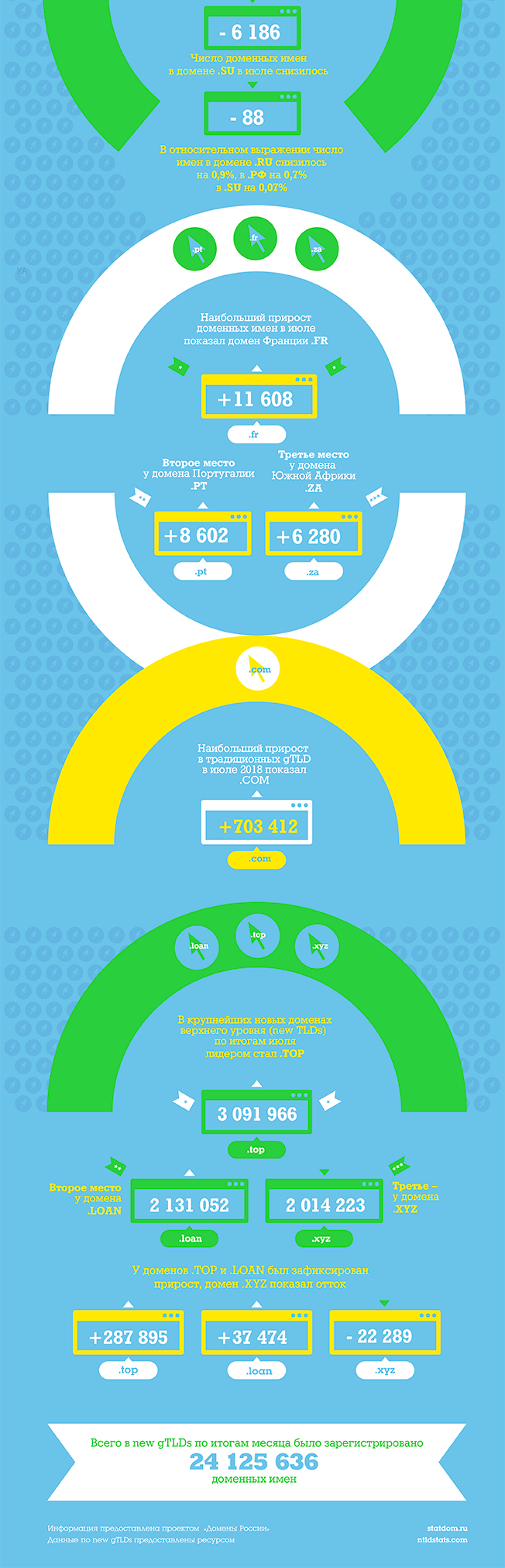 По итогам июля 2018 года число доменных имен на обслуживании в Техническом центре Интернет составило 6 016 289. Это ниже результатов июня 2018 года на 52 632 имени или на 0,9%. На конец июля 2018 года число доменных имен в .RU составило 5 079 334 доменных имени, в .РФ – 817 718 доменных имен. Оба домена в июле показали отток: в .RU отток составил -46 382 доменных имени или 0,9%, в .РФ – -6 186 доменных имен или 0,7%. Домен .SU также показал небольшое снижение – с 117 112 доменных имен в июне до 117 024 доменных имен в июле, отток за месяц составил 88 доменных имен или 0,07%. В домене .ДЕТИ 1218 имен, в домене .TATAR 995 имен.