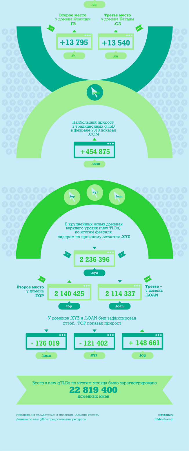 Наибольший прирост в традиционных gTLDs в феврале был вновь зафиксирован в домене .COM, он составил +454 875 доменных имен.